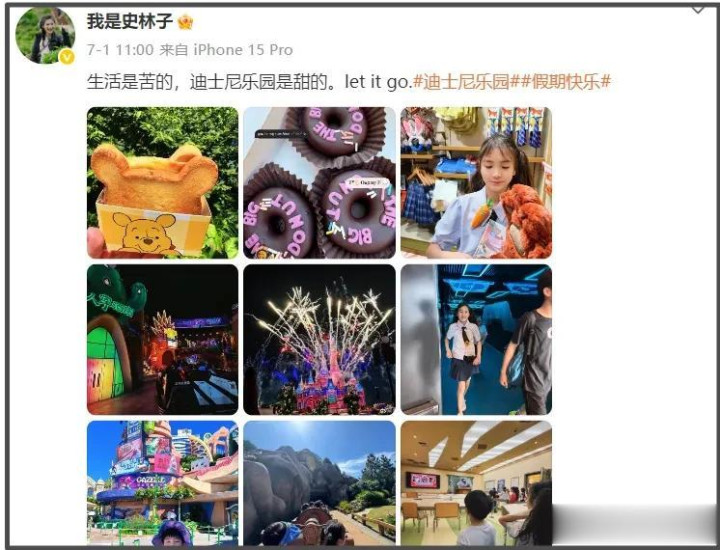 唯有一条7月份发布的动态,史林子隐约流露出一丝情绪,她带着孩子去了迪士尼,感慨“生活是苦的,迪士尼乐园是甜的,let it go”。