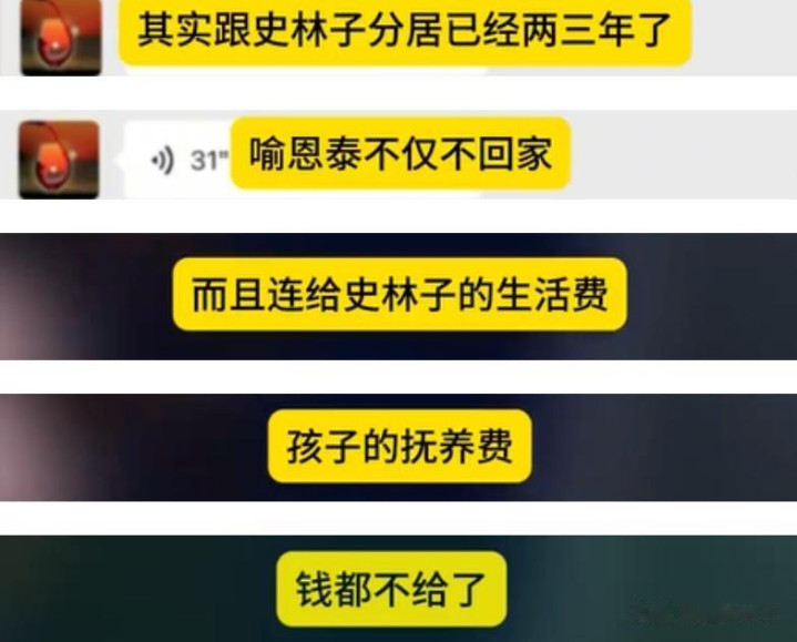 总结一下卓伟爆料内容,原来喻恩泰和史林子已经分居两三年了,喻恩泰在外拍戏,不回家也不给妻子生活费,更重要的是还不给孩子抚养费。